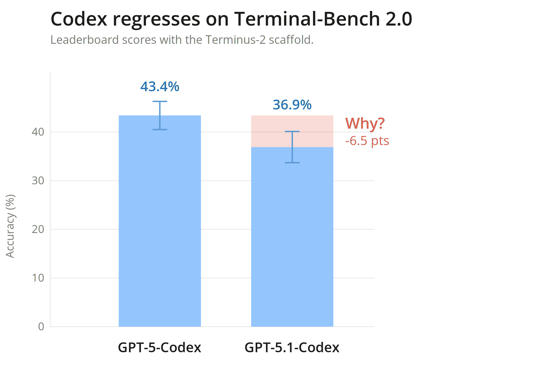 GPT-5.1 Codex underperforms GPT-5 Codex by 6.5 percentage points on Terminal-Bench, even with the same scaffold. What explains the regression? Using Docent, our AI-backed analysis tool, we find that the regression stems from time-out errors — not performance. GPT-5.1 Codex times out at nearly twice the rate of GPT-5 Codex (49% vs. 29%), despite Terminal-Bench's system prompt never mentioning the time constraint.